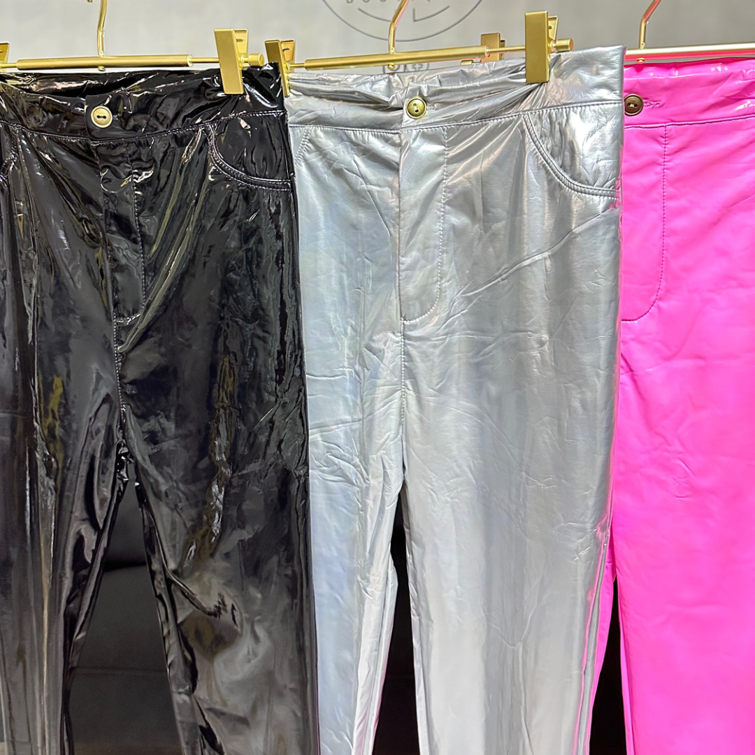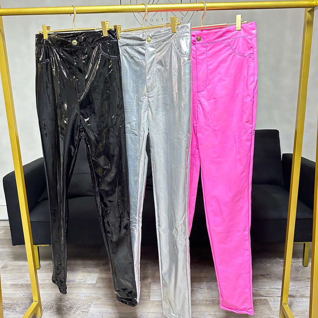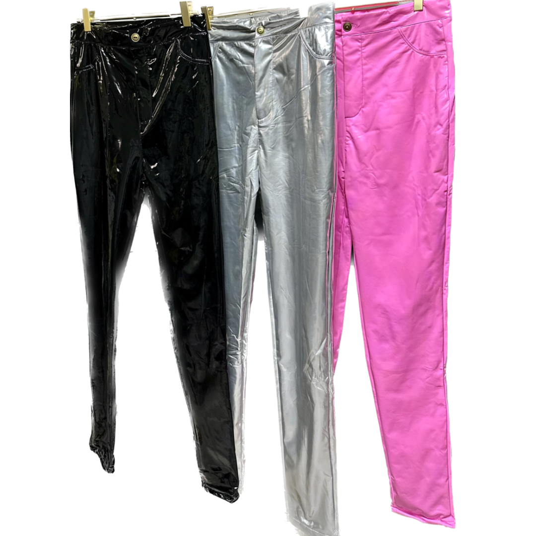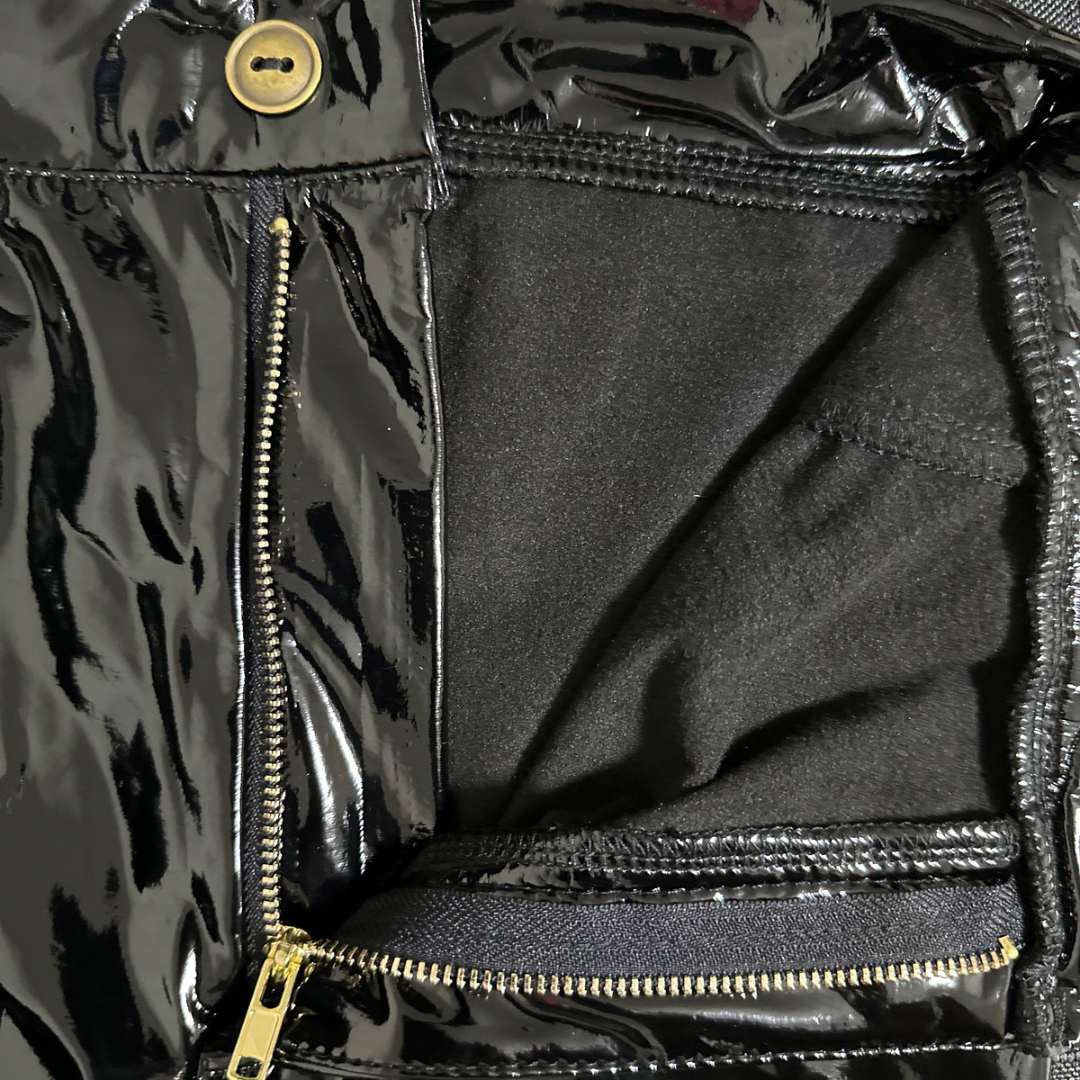 High waist, stretchy faux patent leather pants with a warm lining. Zipper and button closure. No pockets.