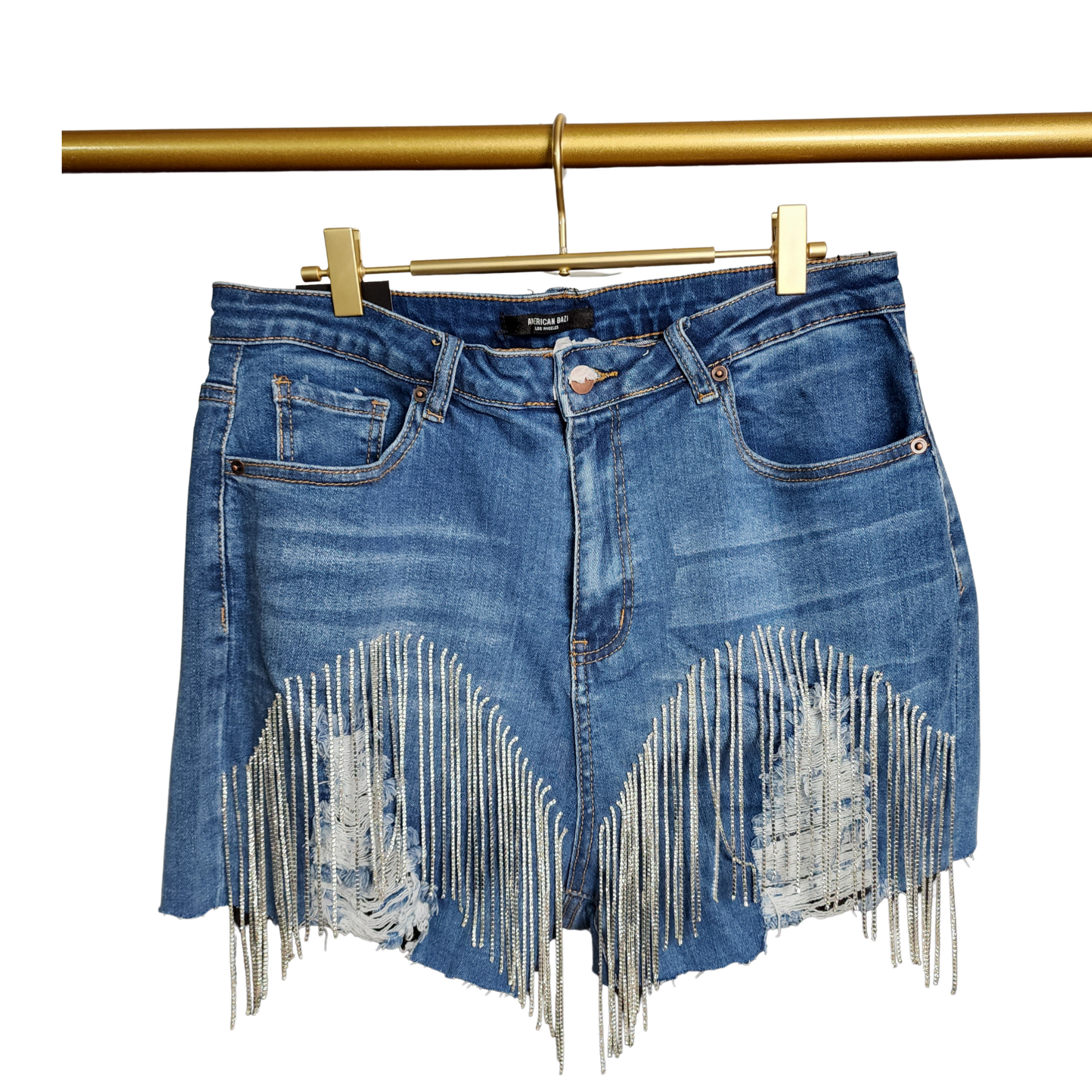 Custom made high waisted denim shorts with rhinestone fringes. These shorts do have a nice amount of stretch.