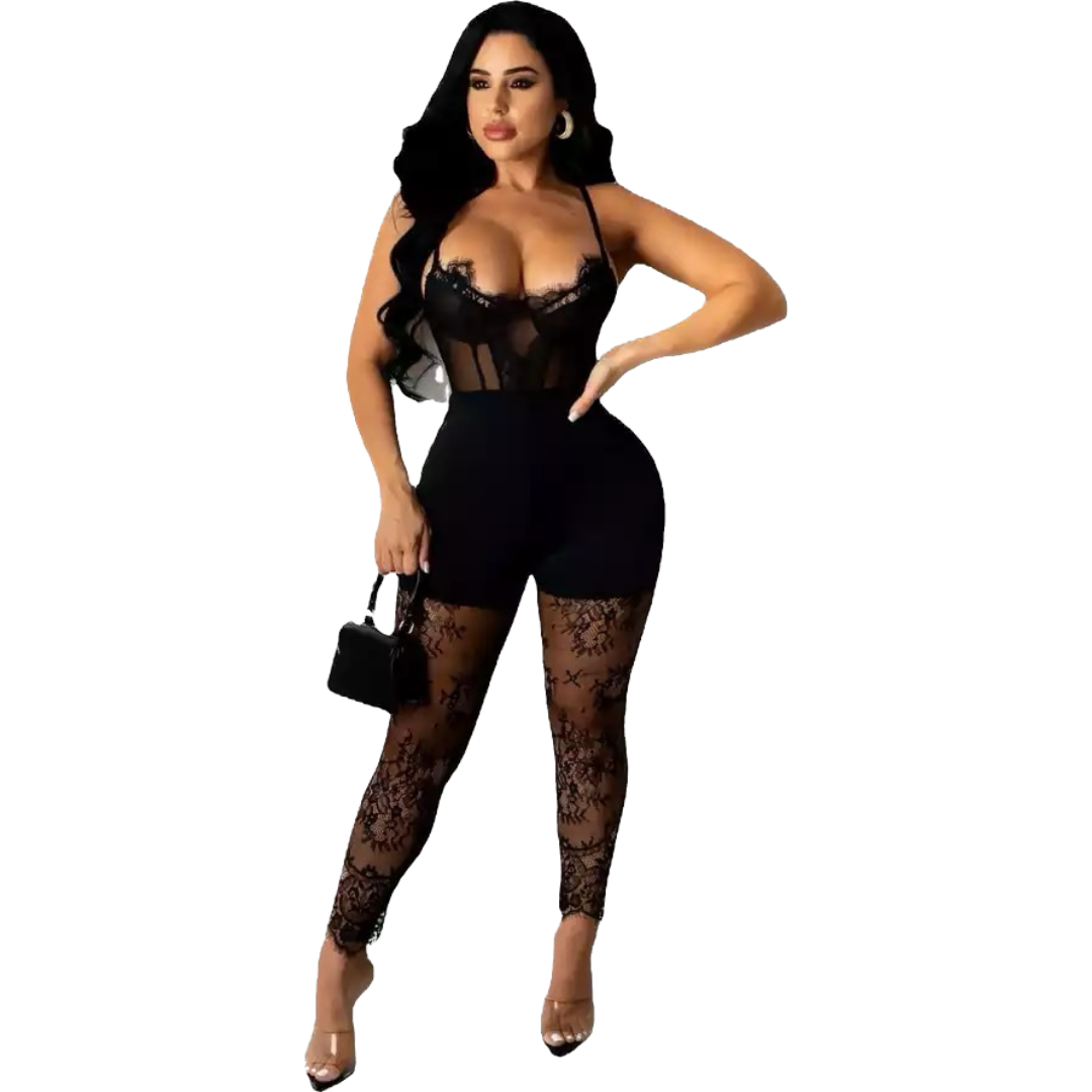Black lace romper with corset like top. Very minimal stretch.