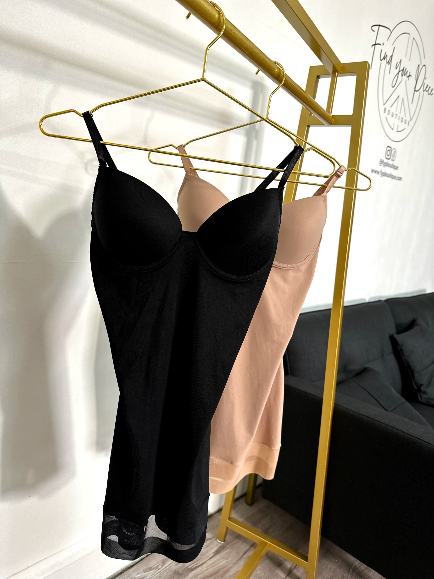 Sexy mini slip dress with mesh bottom. This dress is very stretchy and has a little bit of control.