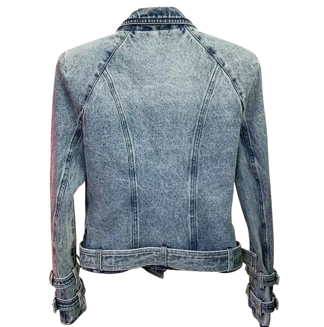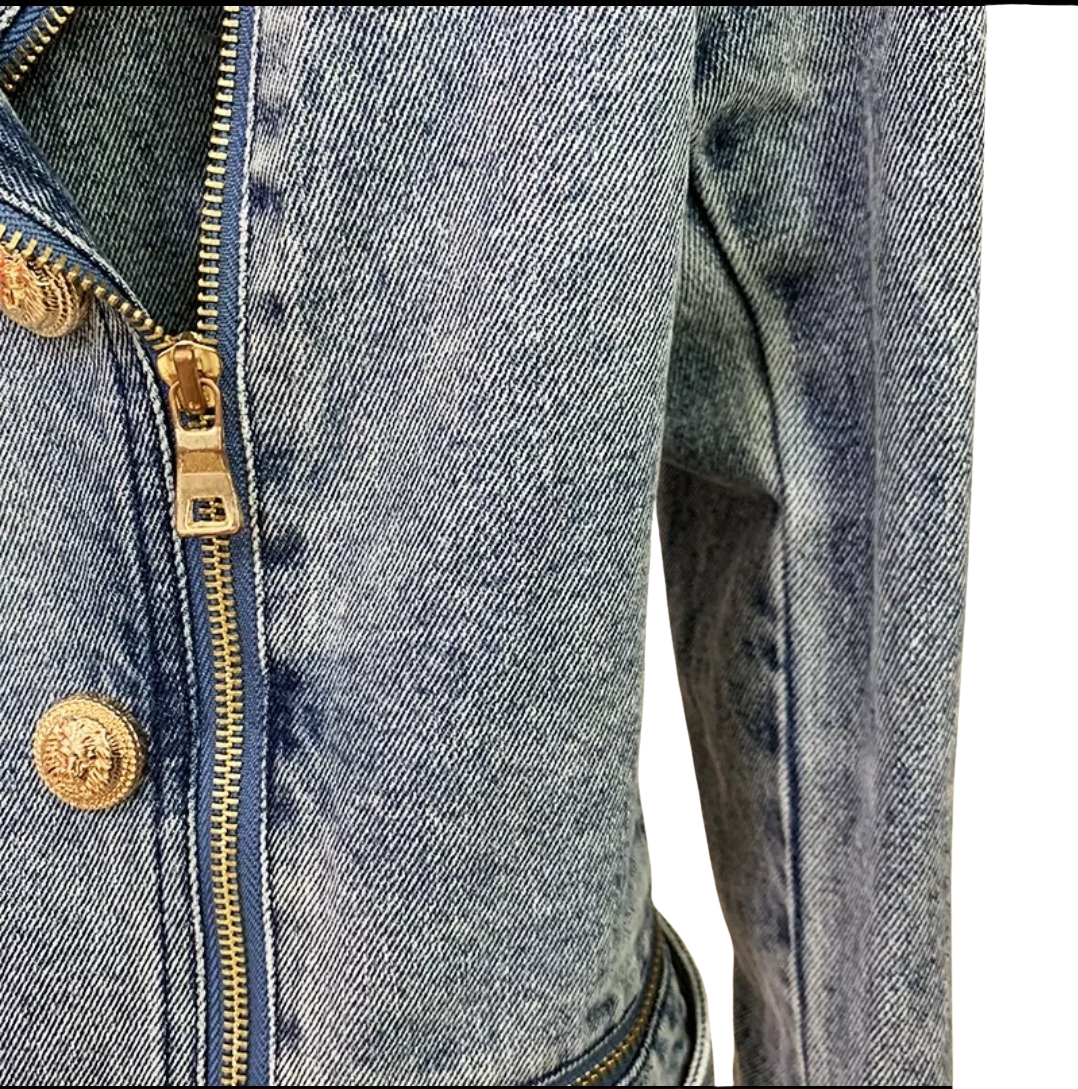 Very beautiful denim motorcycle style jacket with gold button details. There is a removable belt