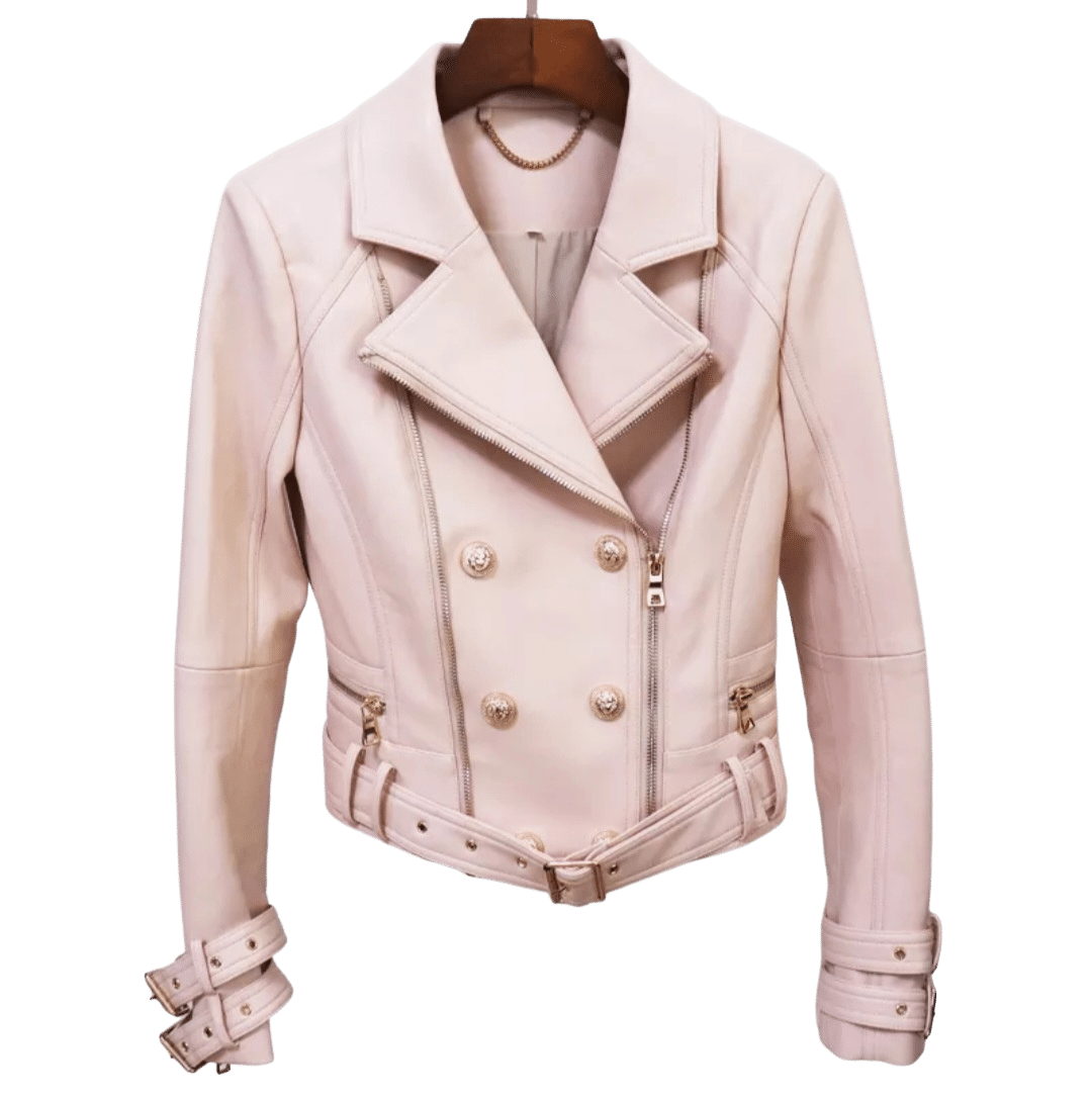 Pink Faux Leather Moto Jacket with gold buttons and zippers. Very soft material.